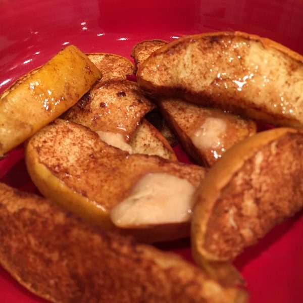 Core and slice apples. Toss in cinnamon. Line a baking sheet with parchment paper. Place apples in a single layer on pan. Bake for 20 minutes. Top with a small pat of cinnamon honey butter.