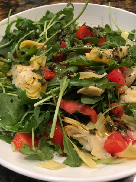 Arugula Salad with Artichokes, Tomatoes, and Pesto Vinaigrette (adapted from Ellie Krieger)