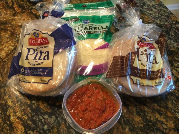 On a single pita, add sauce, cheese, and toppings. Repeat for each pita. In the toaster oven or oven, cook until cheese is melted, about 5-8 minutes. Note: This can be done under the broiler, but keep close watch over it so it doesn’t burn.