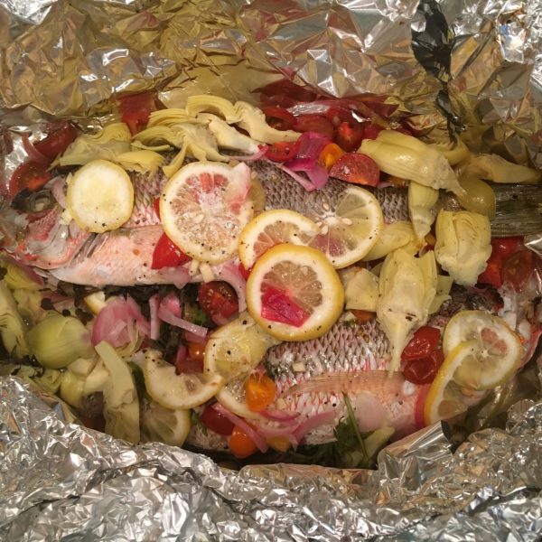 Use heavy duty foil and make a 15 by 48-inch sheet. Fold in 1/2 and lay on baking/cookie sheet. Unfold and lay snapper diagonally on sheet pan on top of 1 layer of foil. Salt and pepper fish, inside and out. Place herbs inside cavity of fish along with 1/2 of lemon, and 1/2 of red onion. Put garlic, and remaining lemon and red onion on fish and lay tomatoes and artichoke hearts around, creating somewhat of a wall. Pour wine over fish and dot with butter. Fold over edges of foil to create and almost airtight seal. Bake in oven for 30-40 minutes (until internal temperature of 130-145 . Carefully open and serve (be aware of bones in the fish).