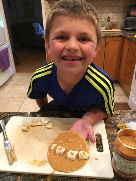 Heat the tortillas in the microwave for about 30 seconds. Spread the peanut butter on the tortilla and top with the manzano. Roll and enjoy!