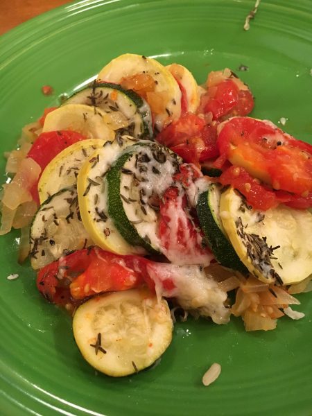 Finely dice the onion and mince the garlic. Sautee in a skillet with 1-2 tsp. of olive oil until softened (about 5 minutes). While the onion and garlic are cooking, thinly slice the rest of the vegetables. Lightly spray with olive oil. Sprinkle generously salt and pepper. Spray an 8×8 square or round baking dish with non-stick spray. Spread the softened onion and garlic in the bottom of the dish. Place the thinly sliced vegetables in the baking dish vertically, in an alternating pattern. Sprinkle generously with thyme. Cover the dish with foil and bake for 30 minutes. Remove the foil, top with cheese, and bake for another 20 minutes or until the cheese is golden brown and potatoes are cooked through.